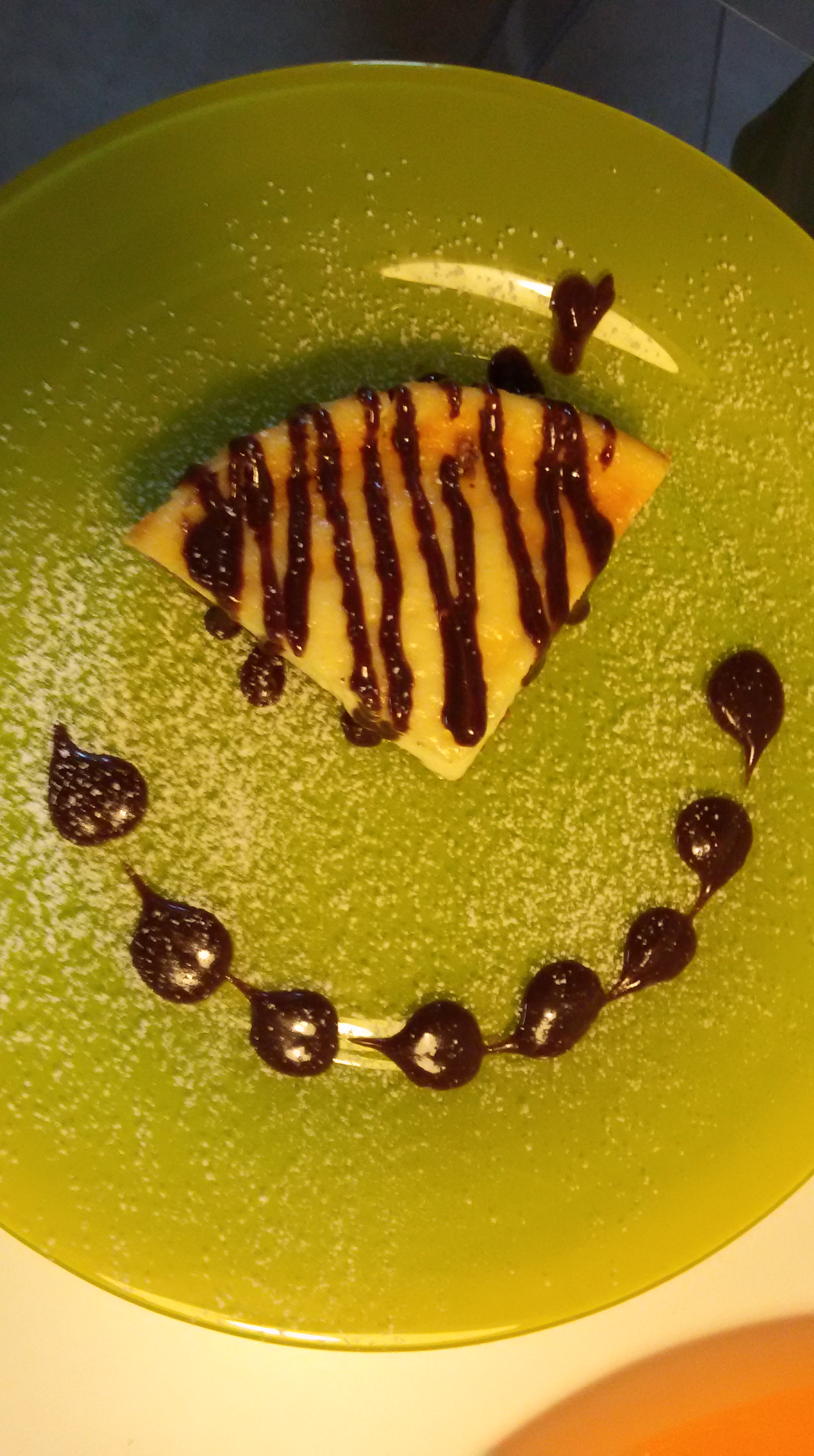 Cheescake al mascarpone su base di biscotti con gocce di cioccolato e servito con Nutella calda